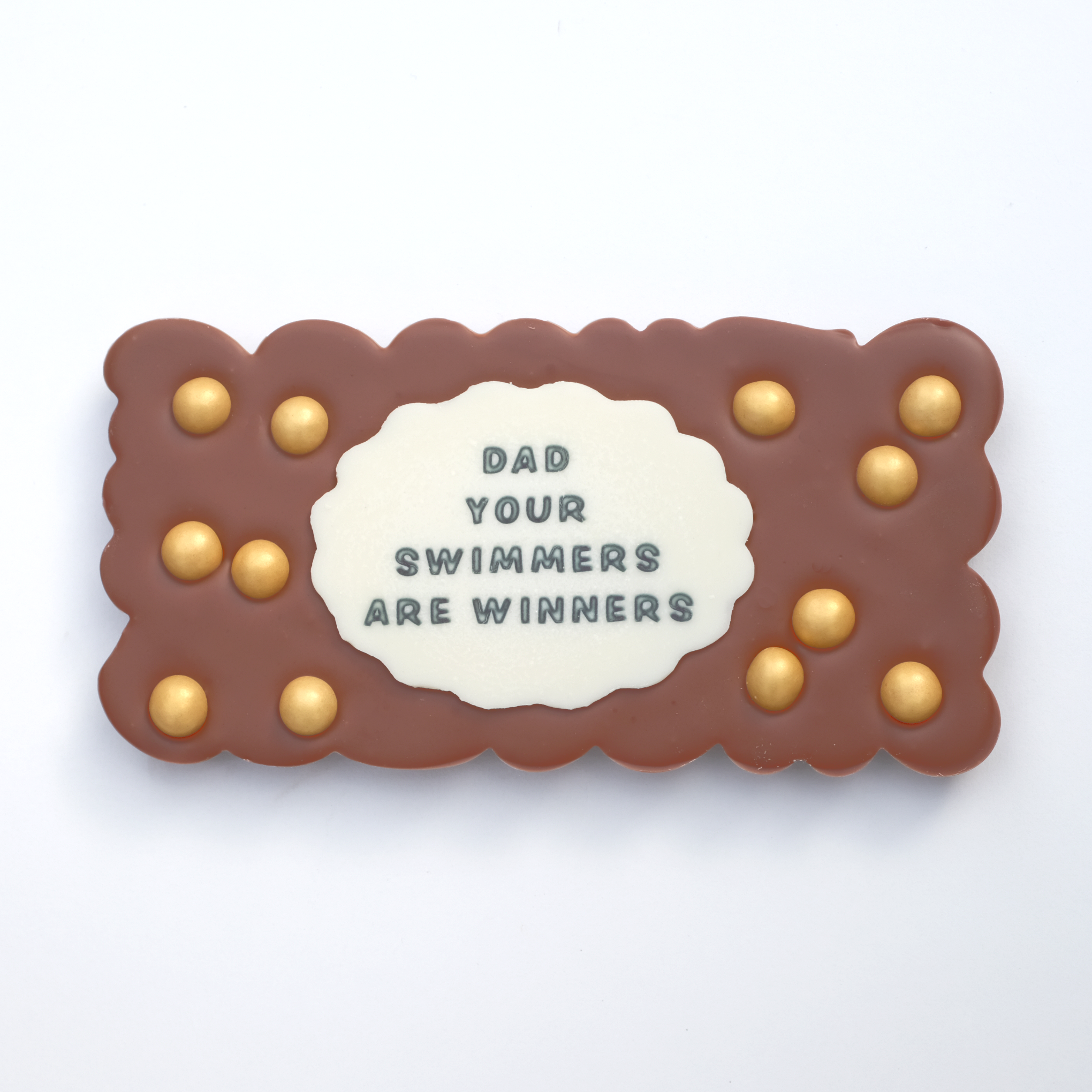 Don't just send them a cheesy last-minute card, sweeten up their special day with our hand crafted chocolate bar, "Dad your swimmers are winners".